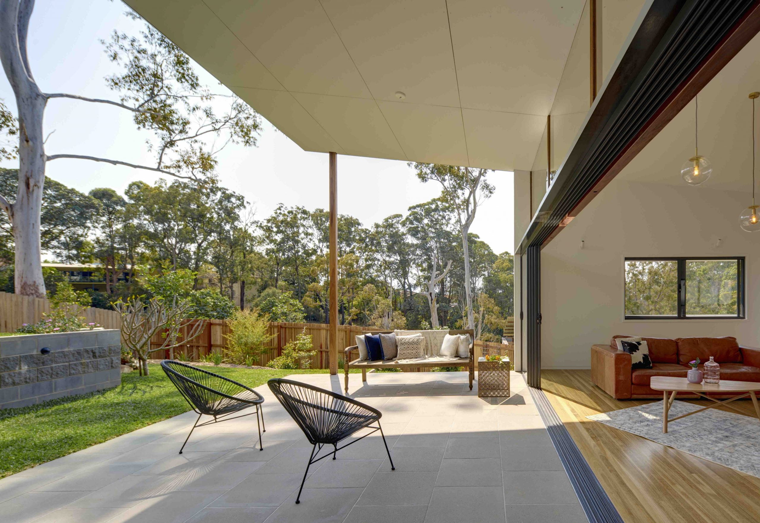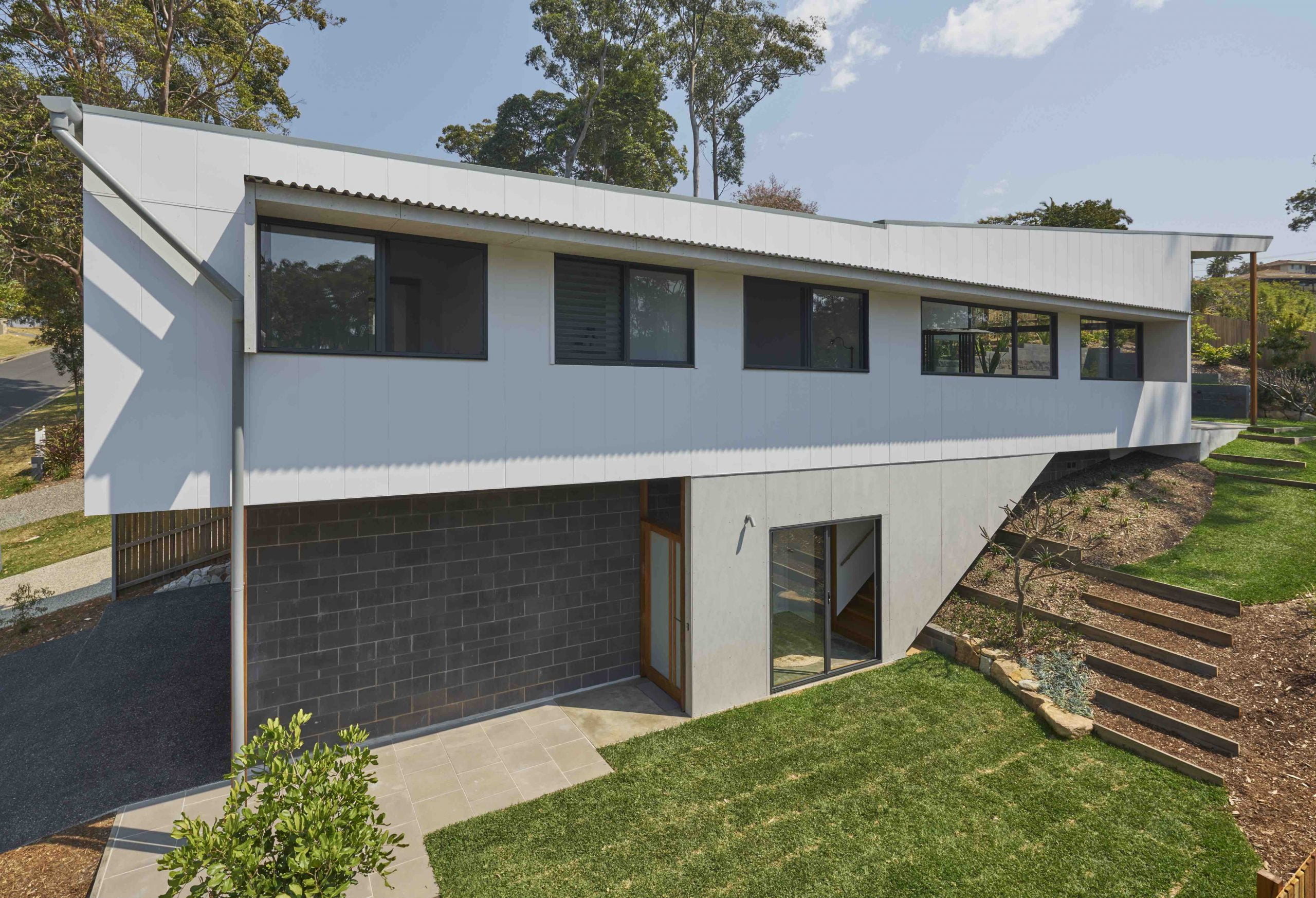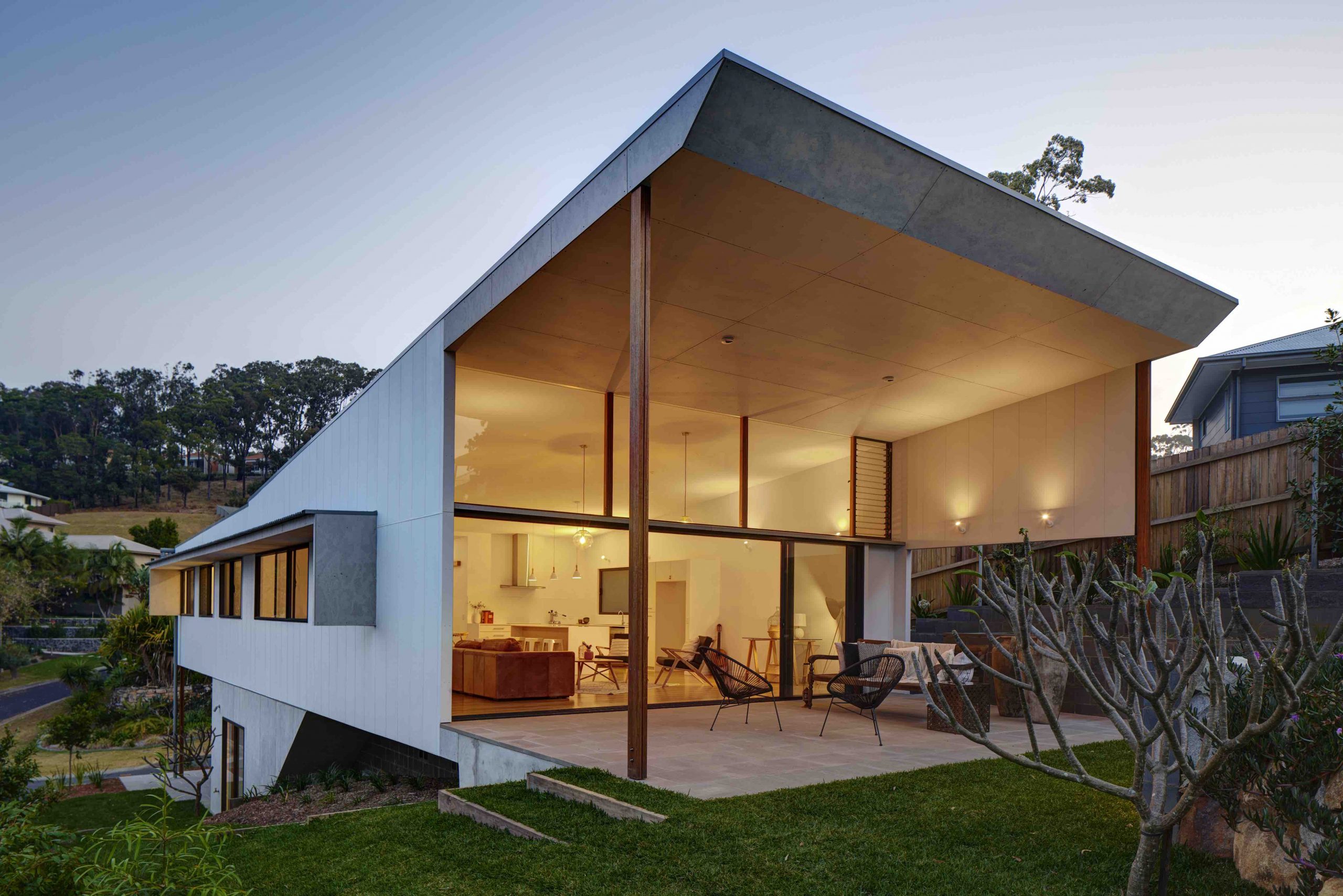 Drawing inspiration from the Coffs Harbour topography and ‘Queenslander’ house typologies the strong form of the house anchors to the site and connects to a large ground terrace. A large open living area contains a wall of glazing that tilts to the north to capture sun and breezes and opens the house to a large aperture of landscape. The four bedrooms are divided around a central corridor by sliding doors that open and close the spaces as needed, provide cross ventilation and create an elegant simplicity in the articulation of the spatial experience.