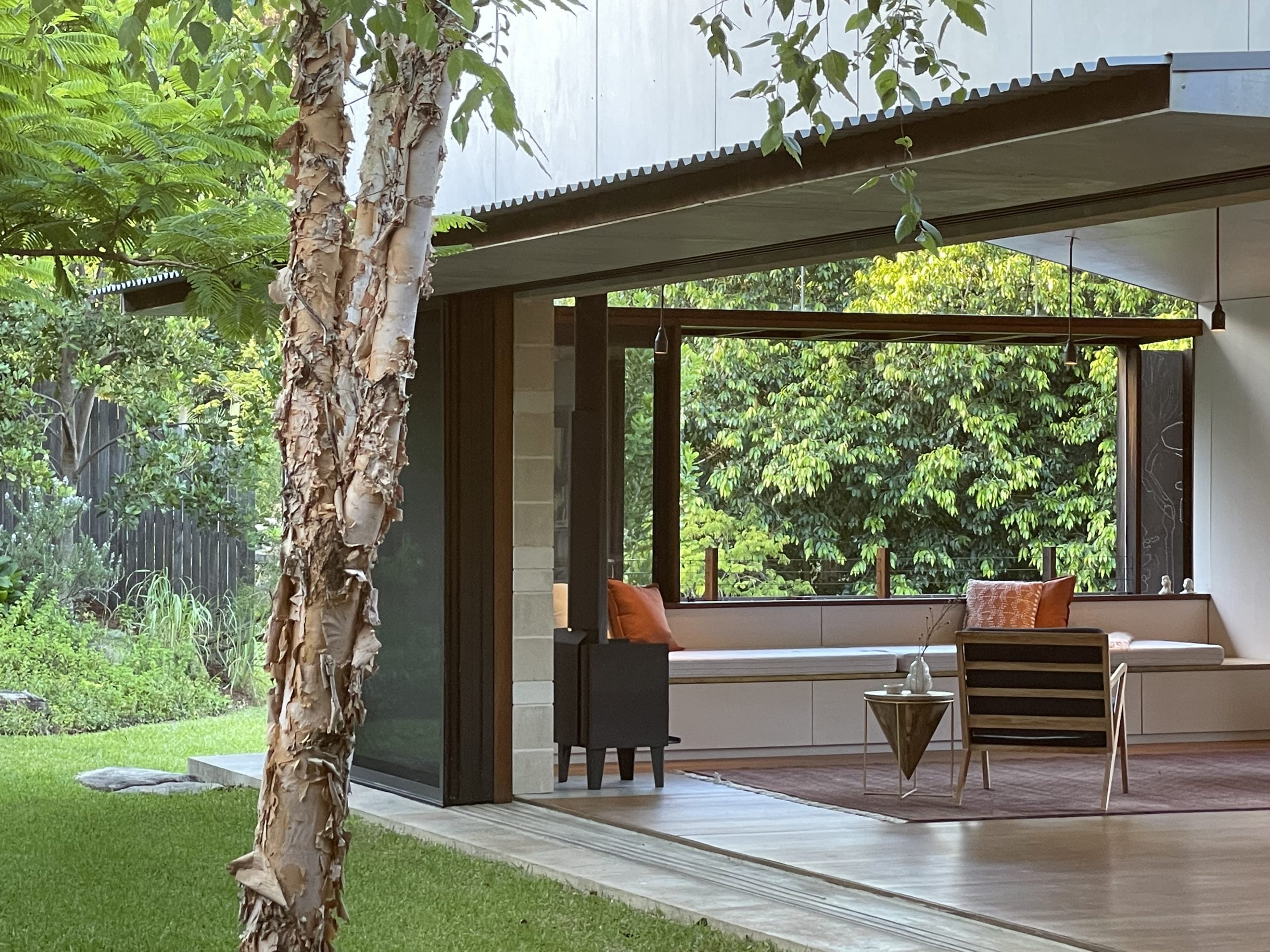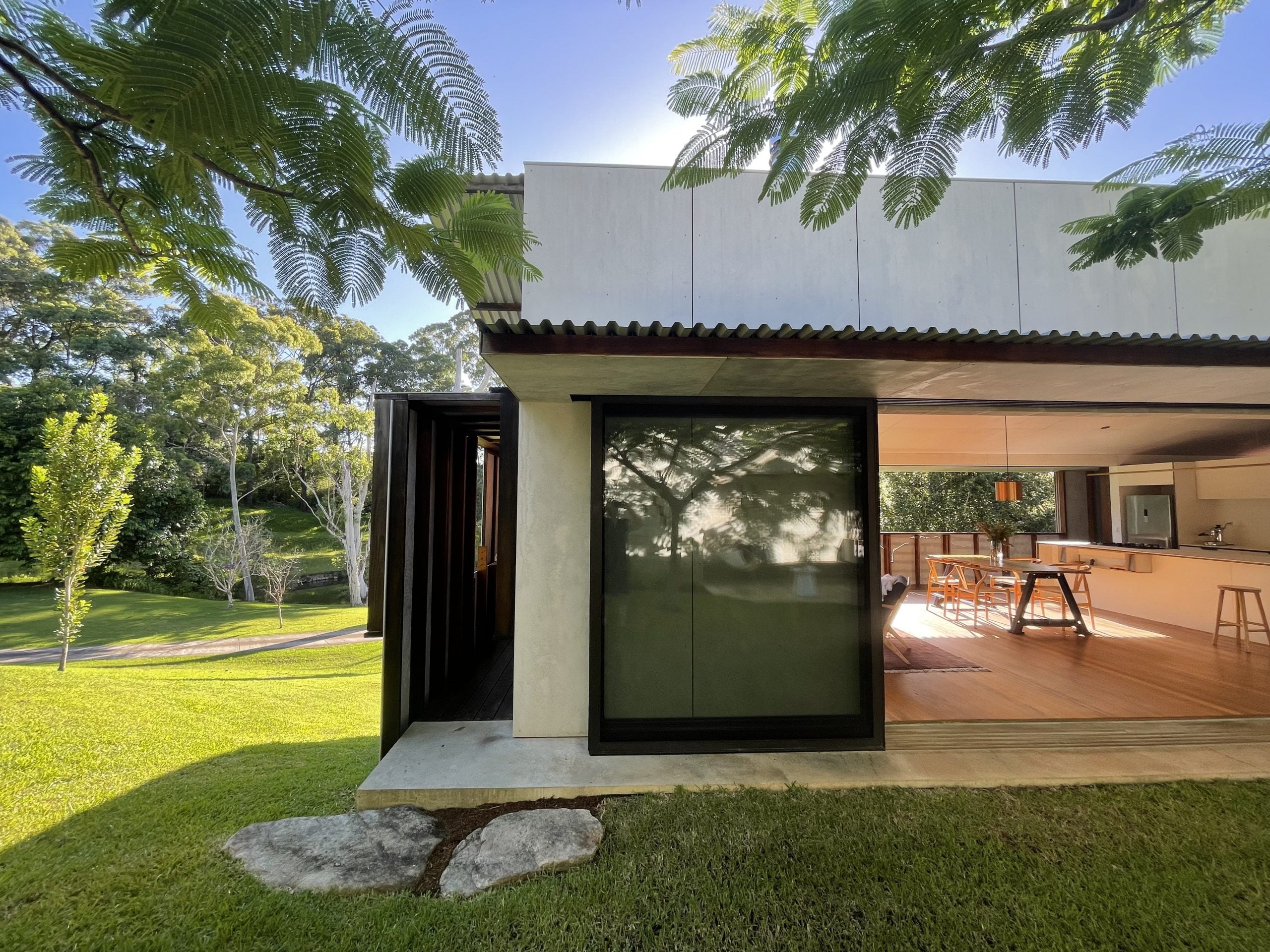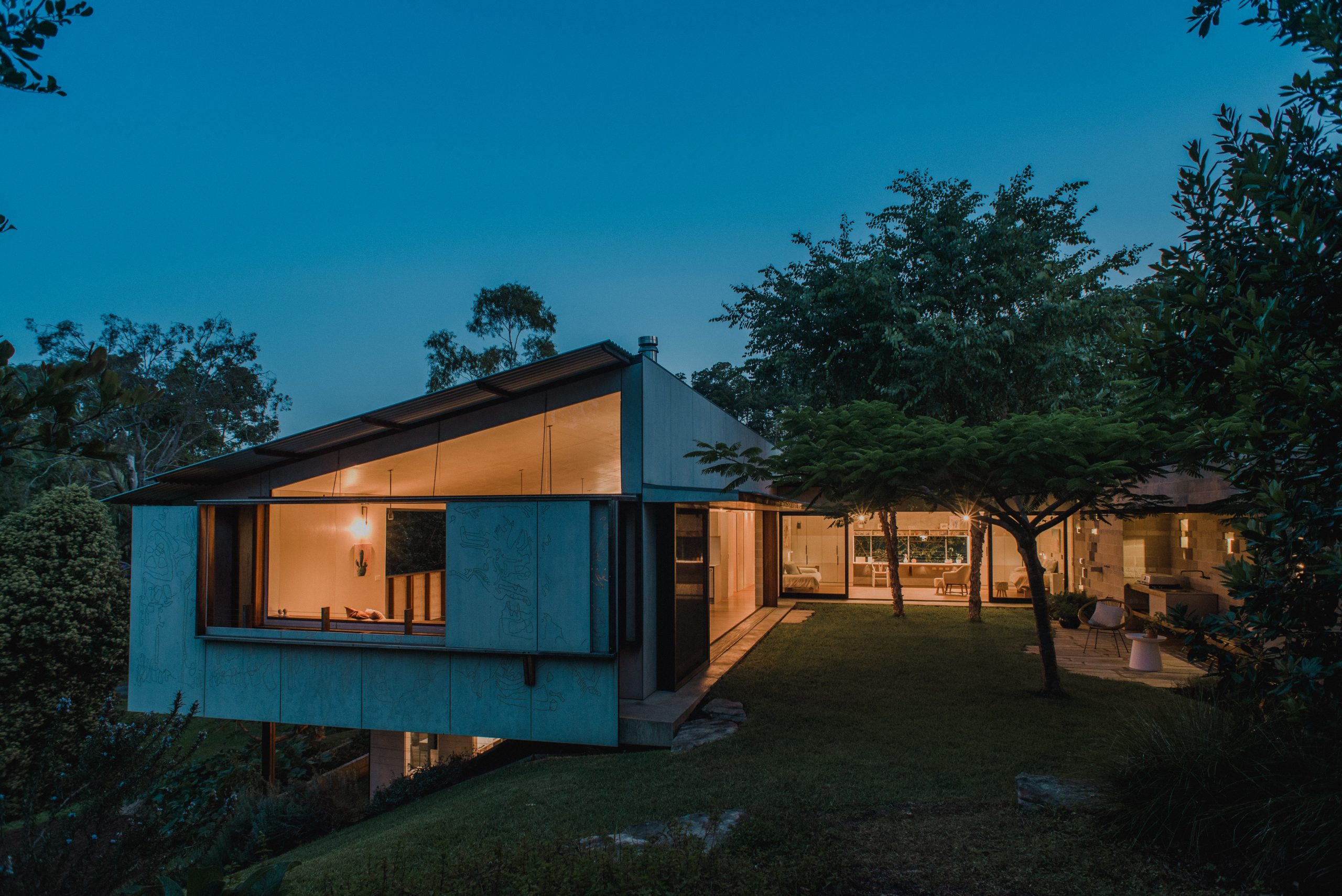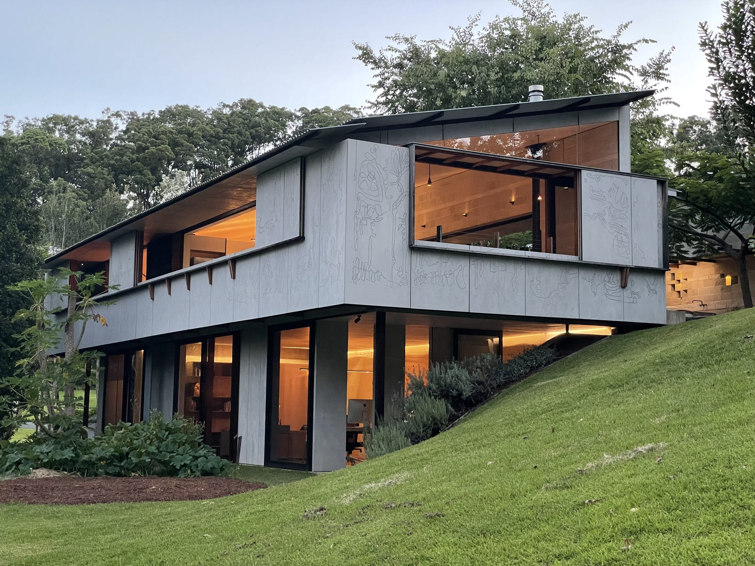 A desire for privacy and connection to the ground drove the form and layout of the courtyard house. On a corner site on an eastern slope overlooking a reserve two concrete block blade walls create two level terraces, one of which became a private courtyard. Flanking the courtyard the house is conceived as a deck with large openings connecting the courtyard through the house to the view beyond. A moveable screen of compressed fibre cement sheeting opens and closes the house to the surrounds for privacy and weather protection as needed. The screen is a public, kinetic art work which is made by perforations in the sheets which in turn allow light and ventilation through when the screen is closed. The art work is displayed during the day as reflected light patterns internally and at night through dots of light when viewed from the outside.