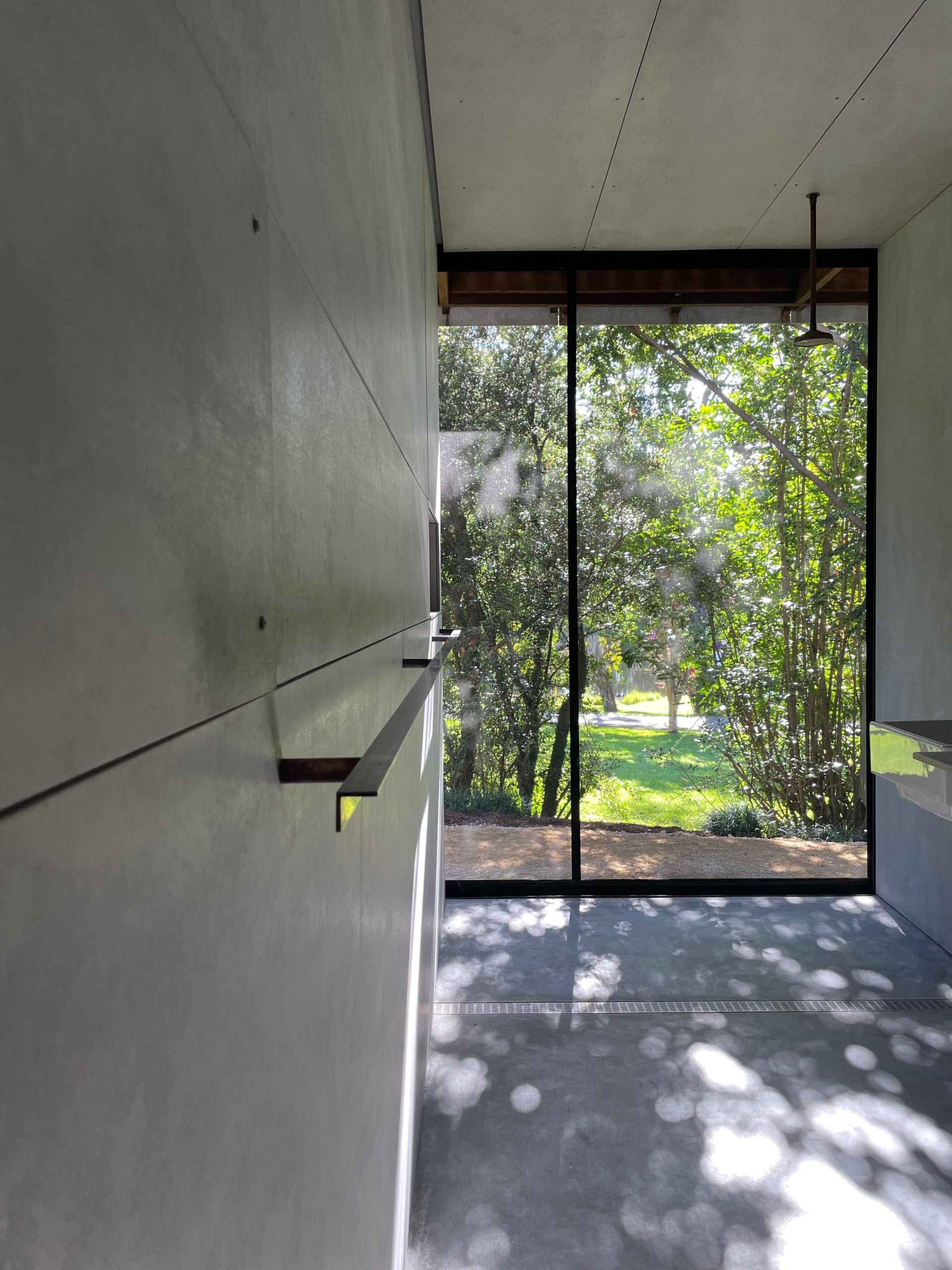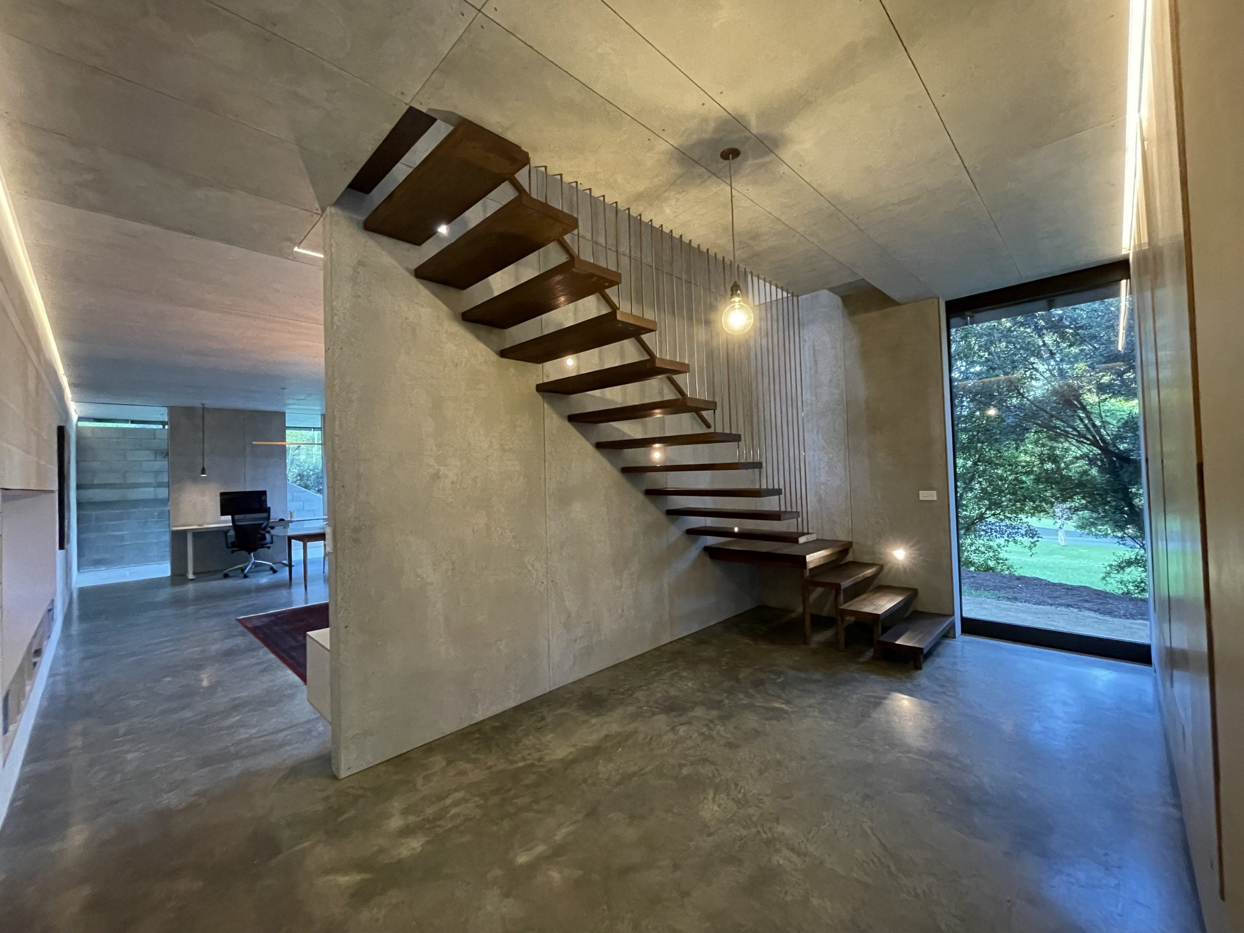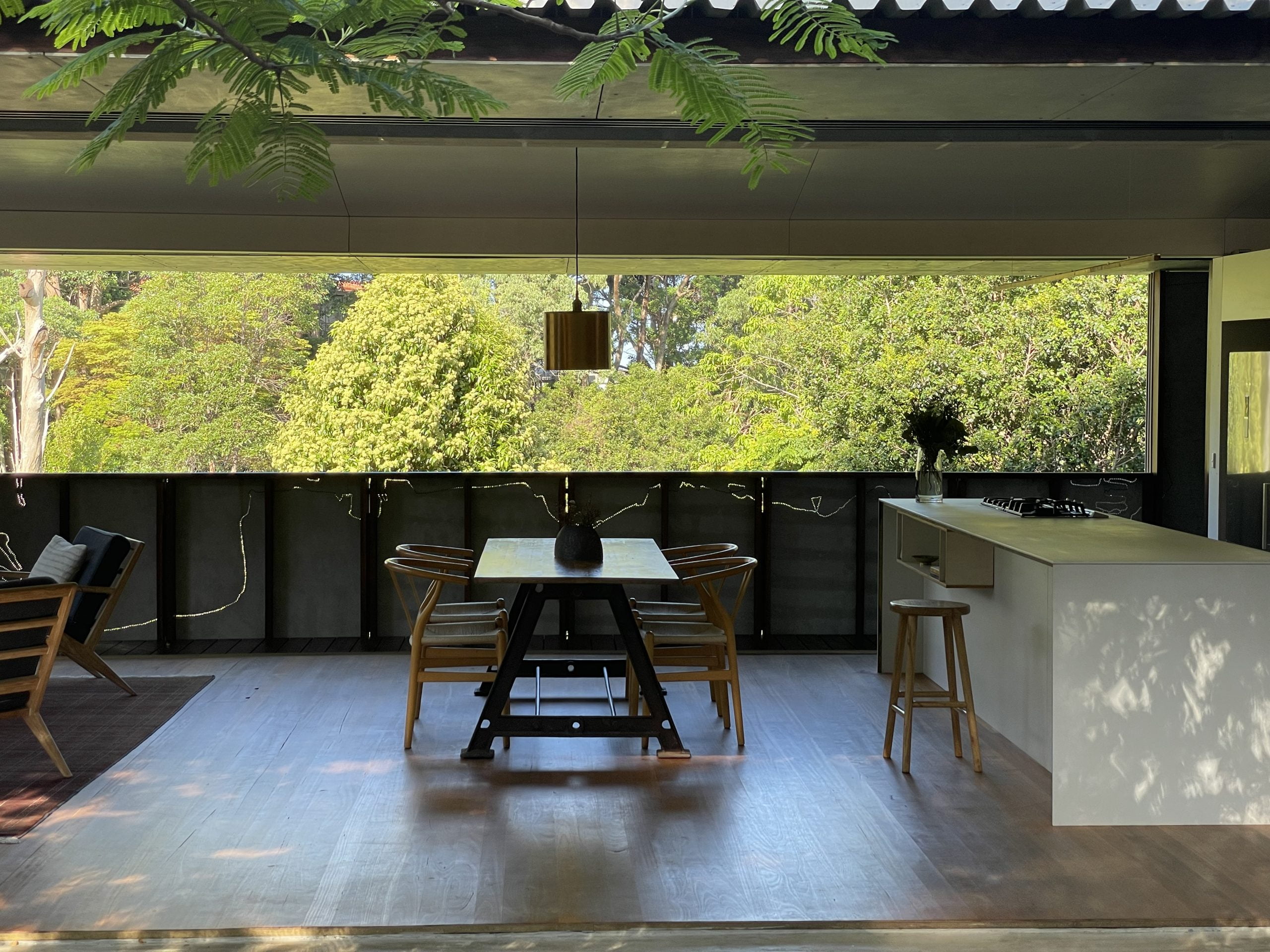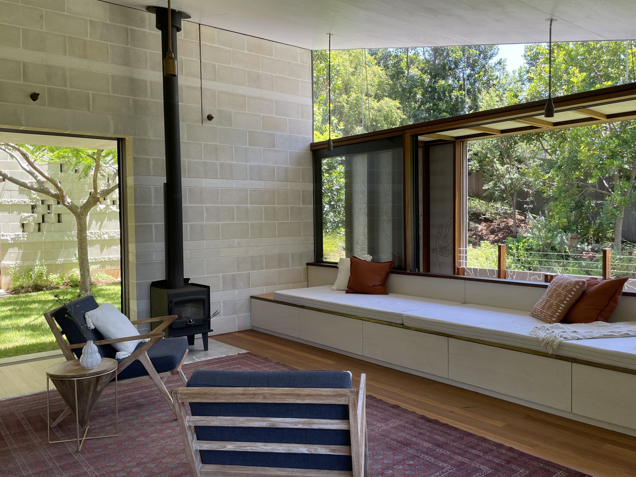 A desire for privacy and connection to the ground drove the form and layout of the courtyard house. On a corner site on an eastern slope overlooking a reserve two concrete block blade walls create two level terraces, one of which became a private courtyard. Flanking the courtyard the house is conceived as a deck with large openings connecting the courtyard through the house to the view beyond. A moveable screen of compressed fibre cement sheeting opens and closes the house to the surrounds for privacy and weather protection as needed. The screen is a public, kinetic art work which is made by perforations in the sheets which in turn allow light and ventilation through when the screen is closed. The art work is displayed during the day as reflected light patterns internally and at night through dots of light when viewed from the outside.