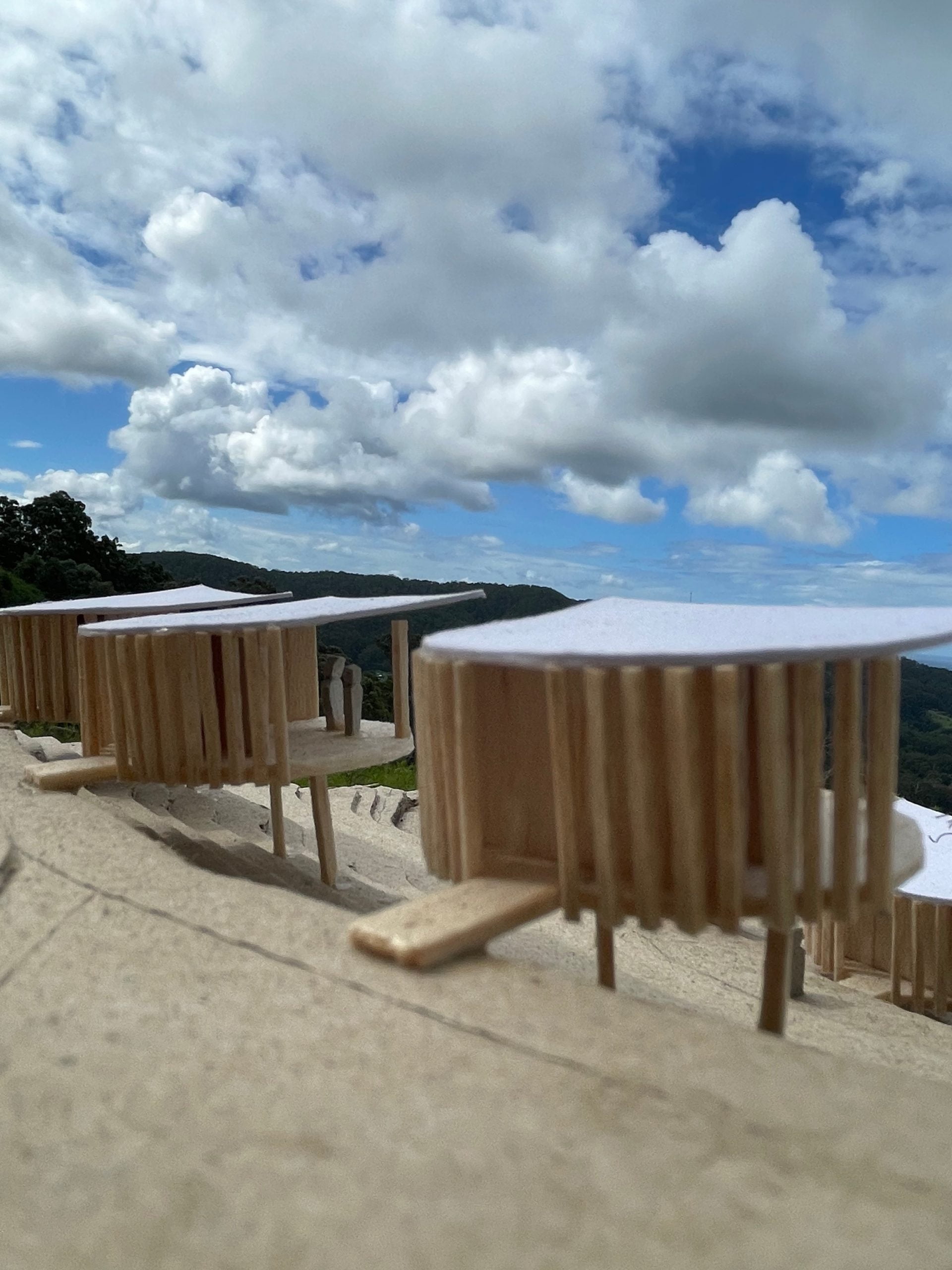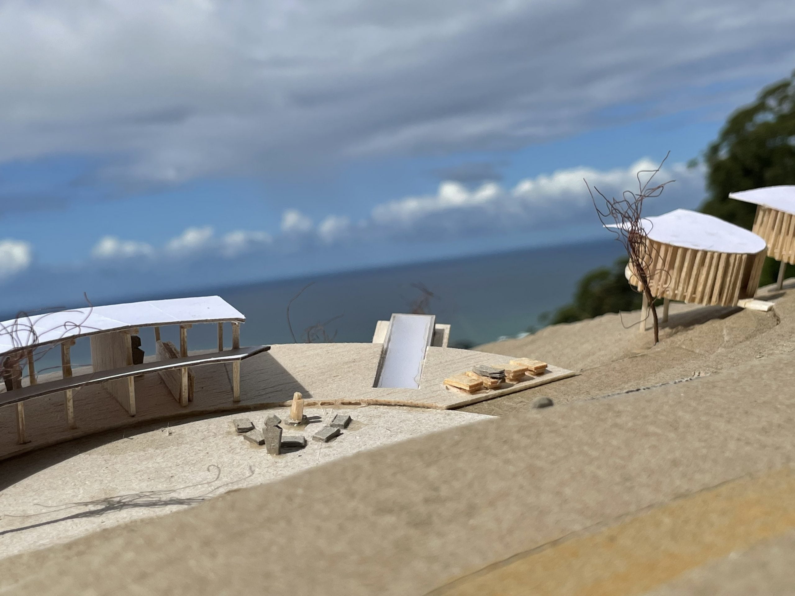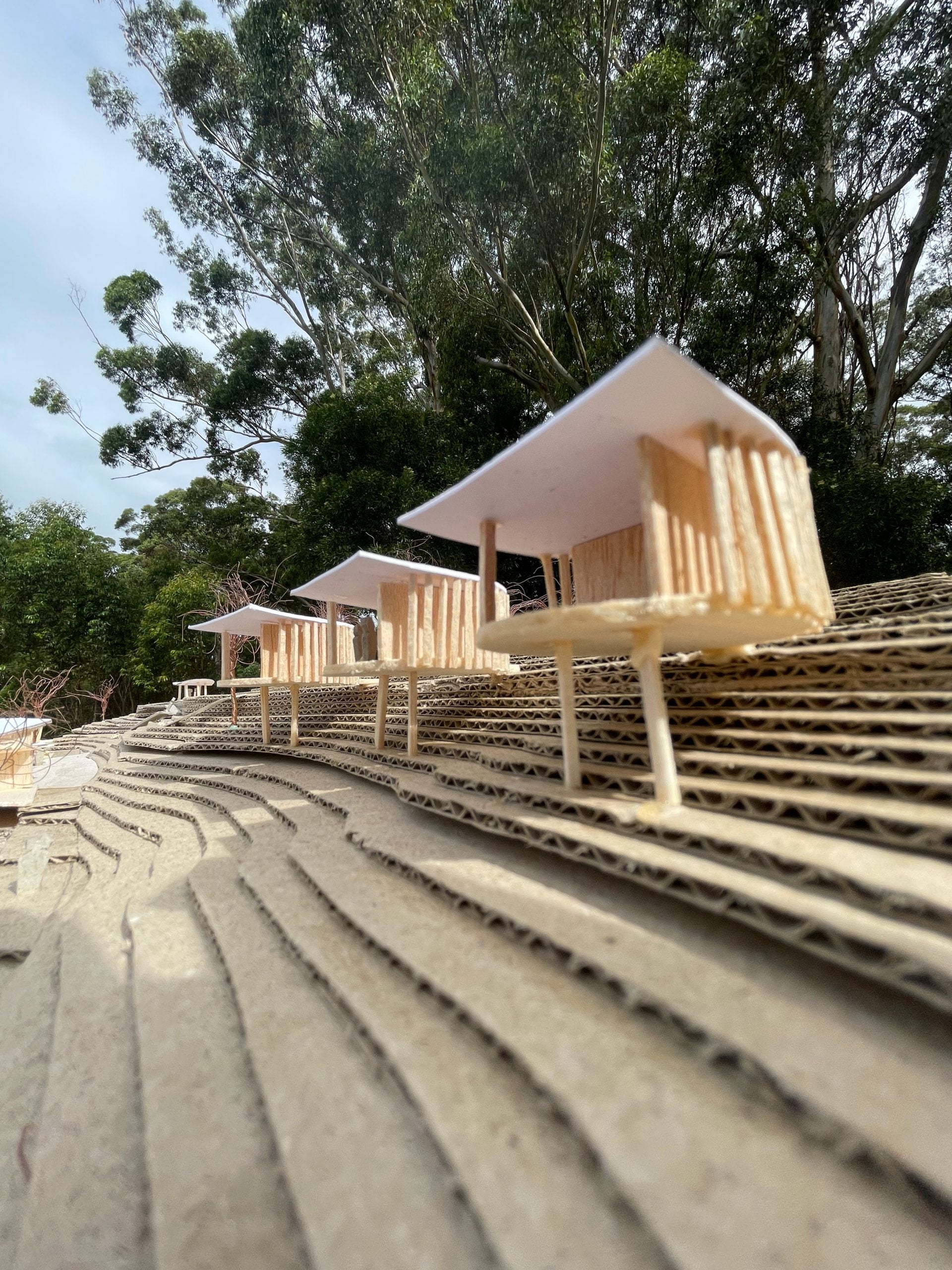 The Gumgali track is a culturally significant ridge-line connecting the inland valleys to the ocean at Coffs Harbour, which forms a crescent defined by green, white and blue. Twenty self-sufficient cabins centred around a communal space for yarning and community engagement. Inspired by the local traditional Gumbaynggirr stories while responding to the sites’ topography, the building aims to prioritise landscape spaces which in turn will provide opportunities to impart knowledge in a traditional way.